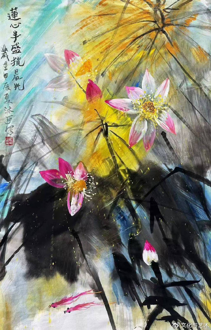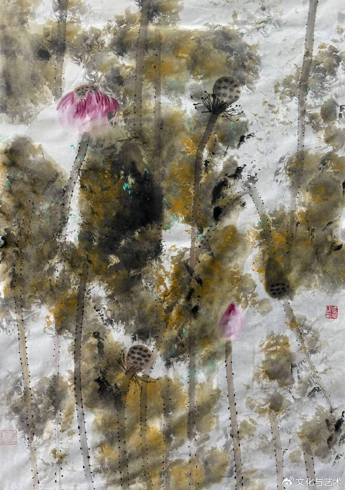【创作哲思】史沐可认为:"真正的荷韵不在茎叶脉络,而在淤泥与星月的对话裂隙。"她刻意保留虫蚀痕迹,在破碎中捕捉本真;以戏剧张力重构荷塘,令每寸光影暗藏角色生命力。其画作既是艺术人格的双生绽放,更是对"常和"奥义的当代诠释——当风起时,满池墨荷吟唱的和声,恰是戏里戏外求索的终极圆满。