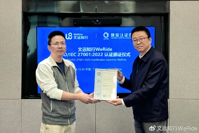 2024年12月30日,文远知行WeRide(Nasdaq : WRD)正式宣布通过ISO/IEC 27001:2022信息安全管理体系认证(以下简称“ISO/IEC 27001认证”),由工业和信息化部电子第五研究所全资子公司赛宝认证中心颁发证书。这一认证标志着文远知行在信息安全管理领域的体系化建设已达到国际权威标准,为全球化发展和跨行业合作提供了重要保障。