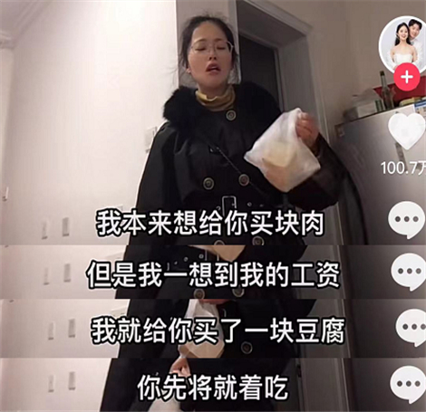 回家想给老公买块肉,但想到自己的工资,肉变成了豆腐,还说“只能等过年回家,上爸妈家吃肉了”。