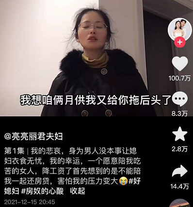 时间回拨到去年底,哥刷到一则心酸又温馨的视频,博主@亮亮丽君夫妇 记录了媳妇儿欲哭无泪的一刻——公司全员降薪,她的基础工资降到2000多。