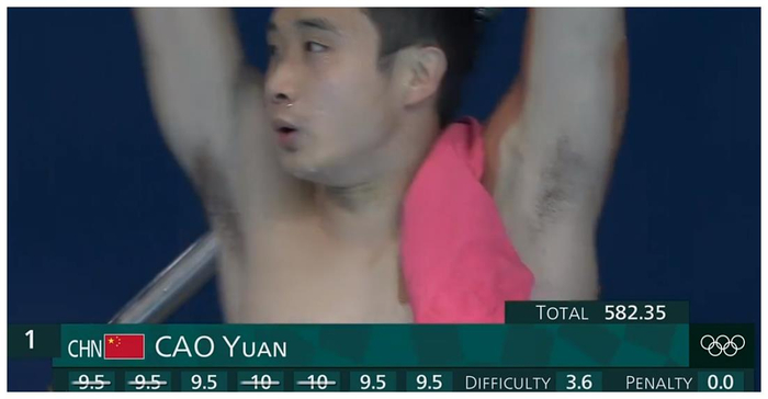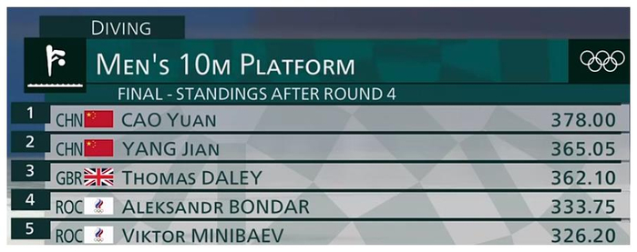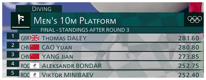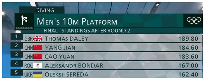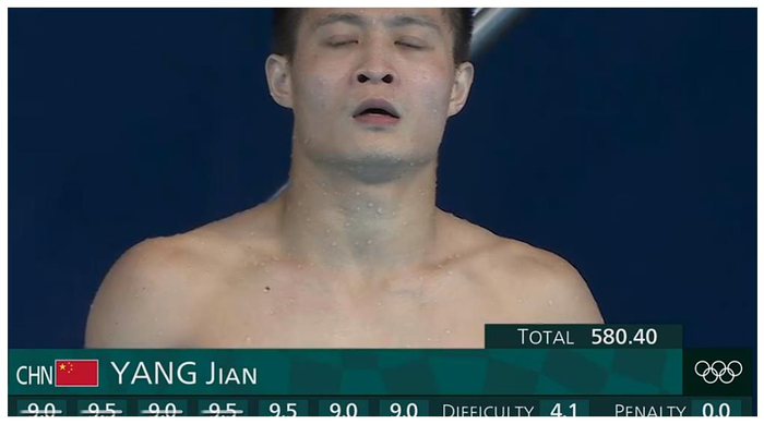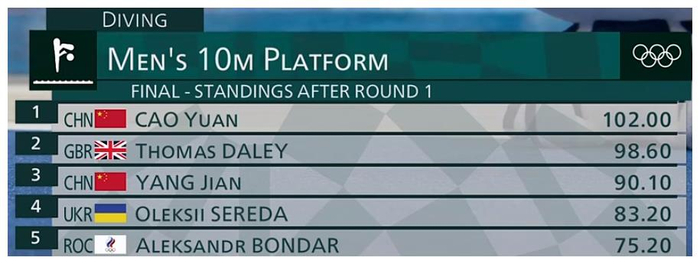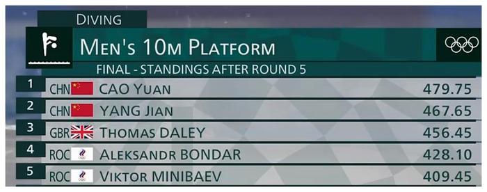 第五跳,戴利跳出了94.35分,表现已经无可挑剔了。没想到接下来2名中国选手,让全世界知道什么叫跳水,其中杨健向后翻腾三周半屈体的动作难度3.6,最终拿到102.6分,而曹缘的动作向前翻腾四周半抱膝难度3.7,最终也拿到101.75。