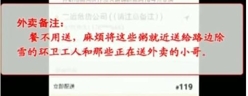 在气温只有零下6度的河南开封,出现了一件特别暖心的事情。市民张华在某外卖平台上点了50份热粥,备注:餐不用送,麻烦将这些粥就近送给路边除雪的环卫工人和那些正在送外卖的小哥。