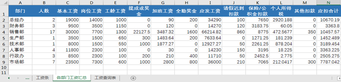 汇总各部门工资情况:制作好部门汇总表的框架后,就可以通过公式来汇总各项数据了,。