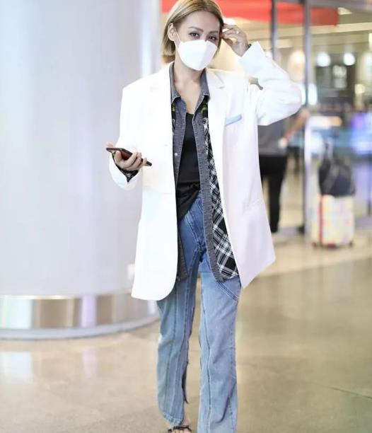这是一身混搭风格了,休闲的T恤,帅气的破洞牛仔裤,正式的西装外套,这三种风格被宁静穿出了一种特别的气场,也是有点拽酷的静静子了,怪不得那么多粉丝挺她。