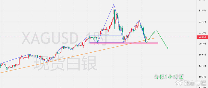白银方面,今天欧盘暂时险守70美元/盎司整数关口,短期会有反弹,不宜追空,但大的调整趋势没有结束,不要有侥幸心理。等待反弹结束之后再择机入场,上方压力关注72.8--73.66