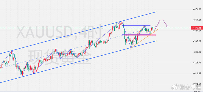 目前4小时MACD指标有重新在0轴上方形成金叉的趋势。如果数据利多黄金,不排除直接冲破4500甚至测试4526的可能。