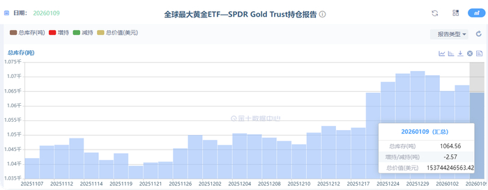 全球最大黄金ETF—SPDR Gold Trust持仓报告显示,该结构昨日减持黄金2.57吨,总持仓来到了1064.56吨。