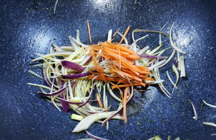 4、再次烧油,油热后先放入洋葱丝煸炒出香味,再加入胡萝卜丝快速煸炒一下