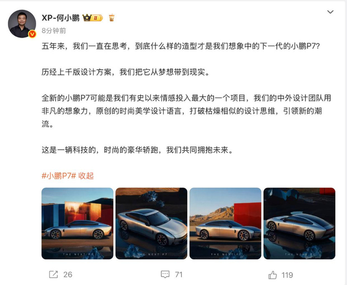 此外,大改款的全新一代P7则承载着帮助小鹏重返30 万级纯电轿车市场的重要使命,何小鹏更表示,全新的小鹏P7 “可能是我们有史以来情感投入最大的一个项目”。