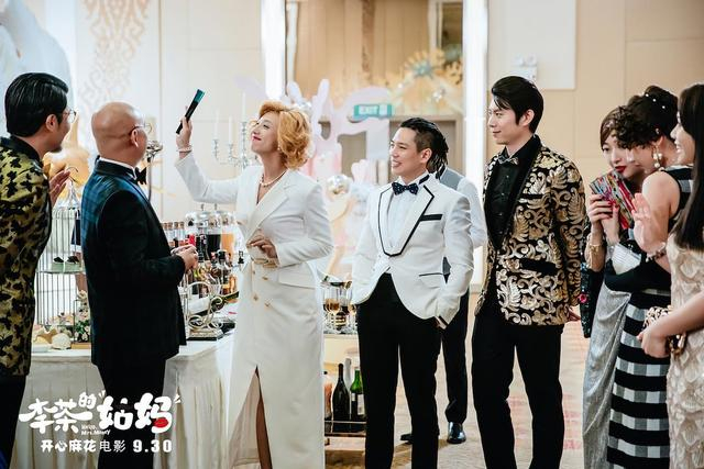 乔装变身成为李茶的姑妈前,黄沧海只是公司里一个不被重视的普通小职员,职场情场两失意,屌丝气质爆棚;阴差阳错变身假姑妈后,他头顶蓬松带卷的金色假发,身穿白色优雅的高定女装,捏着小嗓做女声……再手持一把小扇巧遮轻扇,真真别有一番略带夸张的妩媚的既视感,与男装原身的他完全判若两人!而正是这种外形与气质上的双重的强烈反差感,成为了此片最为吸睛的笑点之一。