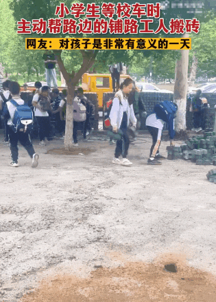 一群小学生在等校车的间隙,主动帮路边的铺路工人搬砖。