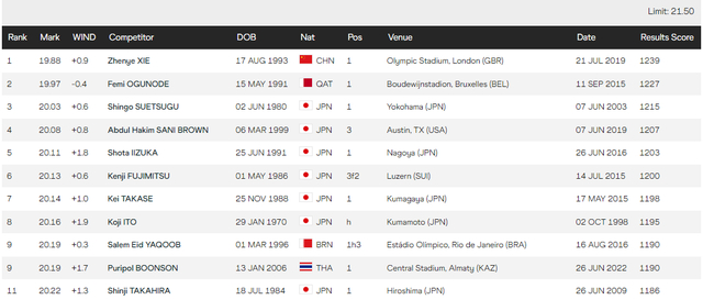如果单纯看200米的成绩,谢震业绝对是国内第一。目前男子200米中国历史前14个最好成绩,都是谢震业跑出的。除了19秒88之外,谢震业的200米第二好成绩是2019年多哈世锦赛上创造的,当时他半决赛跑出20秒03跻身决赛,并在决赛里以20秒14获得第七,这是中国选手在世锦赛该项目上截止目前的最好成绩。