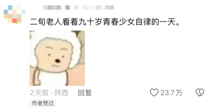 老人像打了鸡血,年轻人是得了鸡瘟。看着阿嬷的视频,年轻人只能自叹不如:又是二旬老人看着九十岁青春少女自律的一天。