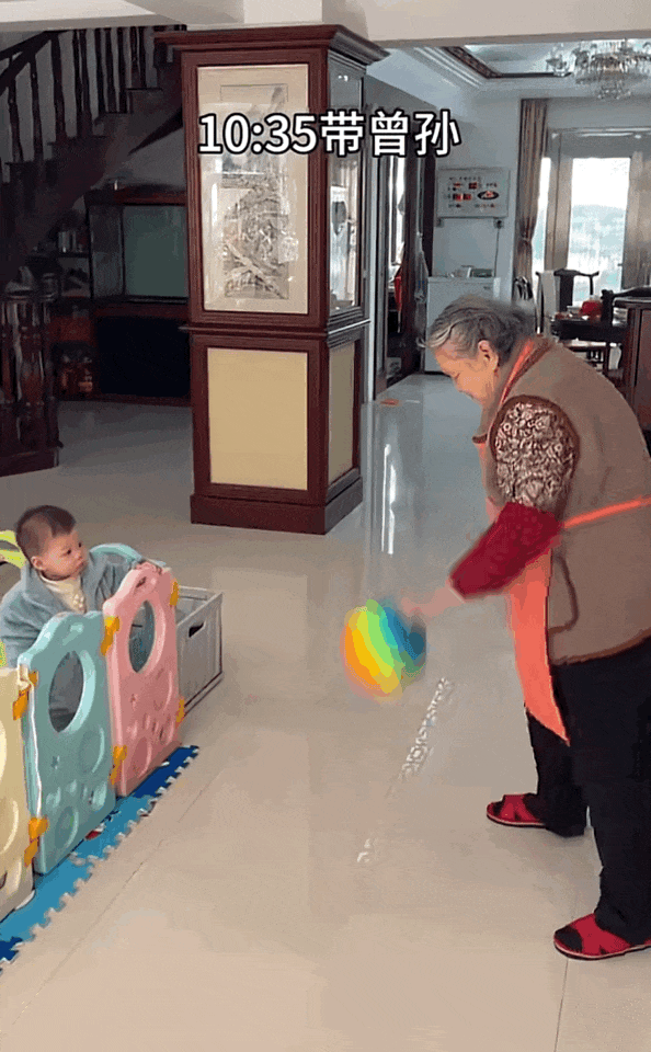 忙完了这么多事情之后,你竟然还能看到阿嬷拍皮球带曾孙,这协调性绝不亚于一个在校中学生。