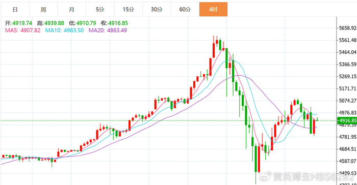 从黄金4小时图看,在创下4430附近的多日低点之后,金价终于迎来了连续性反弹,目前结构上再次形成七连阳,意味着短期的多空争夺再次变得激烈。黄金短暂下跌之后重回5000美元上方,基本面上美伊紧张局势升温支撑避险需求,但美联储人事变动强化鹰派预期,对金价构成压制,因此短期波动率并未有效降低之前,维持高位震荡为主,而美元指数的反弹同样限制金价走强。短期操作建议先多再空,下方关注4855-4820支撑,上方关注4950-4995阻力;综合来看,黄金今日短线操作思路上贺博生建议以回踩低多为主,反弹高空为辅,上方短期重点关注4955-5000一线阻力,下方短期重点关注4880-4830一线支撑。