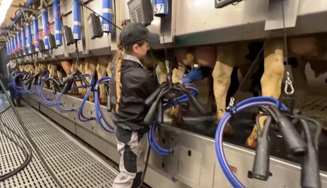 这里就是给奶牛挤奶的地方,眼前这一个个管子,就是自动挤奶的设备,这些牛已经被固定在小小的隔间里,防止它们乱动乱跑,玛丽正在做的是给牛的乳头清洗和消毒。虽然之后还会进行巴氏消毒,但是任何环节都保持卫生,对牛奶的品质来说至关重要。