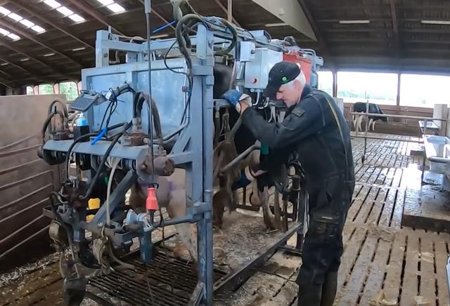 消毒的工具也同样完全自动,只需要对准进行重新,可以看出奶牛并不是很舒服,消毒的过程在不断挣扎,基本上一个人在半个小时内,就能完成这项工作,消毒过后,要自动挤奶器对准牛的乳头,可以看到每个挤奶器上都有4个孔,刚好对准牛的四个乳头,固定完成后启动设备,挤奶器就会开始自动挤牛奶,牛奶会顺着管道,到达一个集中存储的地方,然后进行集中的杀菌消毒,包装等,这些步骤基本上都能自动完成,节省了大量的人力物力,挤完牛奶后,牛会被放出去自由活动,由一个工人对现场进行清洗和消毒。