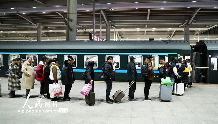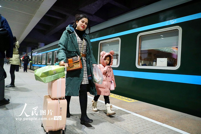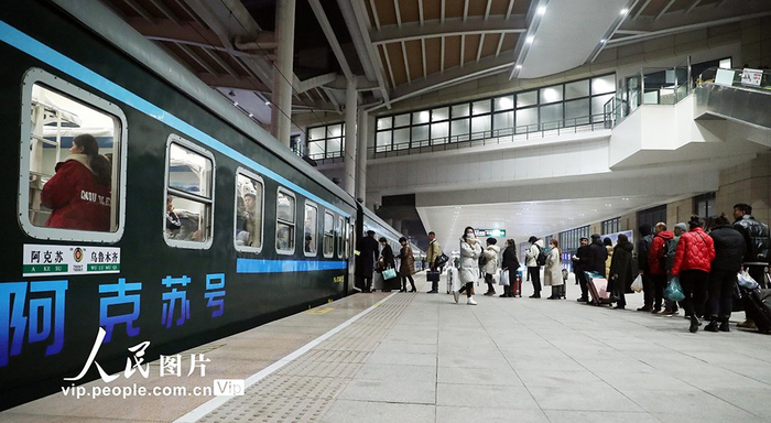 2023年12月1日,旅客在乌鲁木齐站准备乘坐首趟T9536次“阿克苏号”品牌特快旅客列车出行。