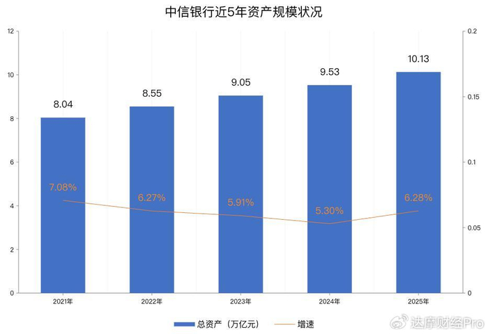 相较于浦发银行,中信银行近五年的总资产规模增长相对更加稳定,虽然此前4年增速连续下降,但总体变动较为平滑,并不会出现大起大落的现象。而且在增速四连降后,2025年该行的资产规模增速再次出现回升趋势。