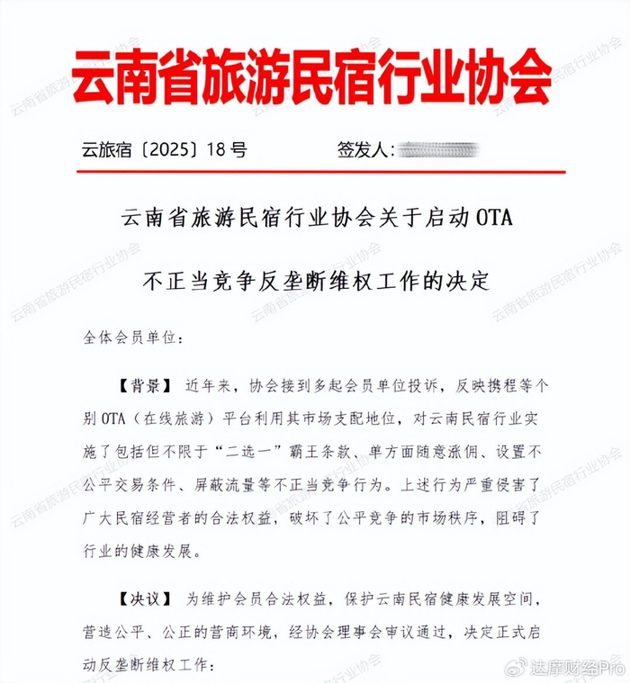 去年12月,云南省旅游民宿行业协会曾发布《关于启动OTA不正当竞争反垄断维权工作的决定》,称携程等OTA平台存在利用市场支配地位,对云南民宿行业实施“二选一”霸王条款、单方面随意涨佣、屏蔽流量等不正当竞争行为。彼时该协会就表示,将针对携程等OTA平台涉嫌滥用市场支配地位的行为发起集体维权。