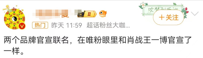 正如网友评论,在唯粉眼里看见两个品牌官宣联名,和看见肖战王一博官宣一样,再加上双方唯粉看不惯对方,一下子就炸了。