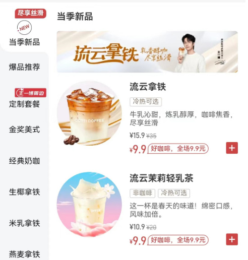 图源:库迪咖啡正如有人评价:国内频繁接触赛车街舞滑板等【酷】品类的流量偶像,并不多。库迪也很会,根据王一博“酷酷”的标签,以粉丝熟悉的王一博专属昵称“王耶啵”为灵感来设计产品,把谐音梗玩明白了:在产品方面,上线生椰啵啵拿铁、蓝椰啵啵拿铁和粉椰啵啵三款新品。在营销方面,库迪喊出口号“年轻就要「库」”。