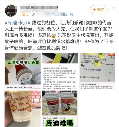 但事实是库迪不只是联名翻车,连产品口碑也翻车。库迪还被骂“咖啡届的刷锅水”,被扒出一些喝库迪喝到苍蝇、喝出胃炎等产品食品安全的黑历史。