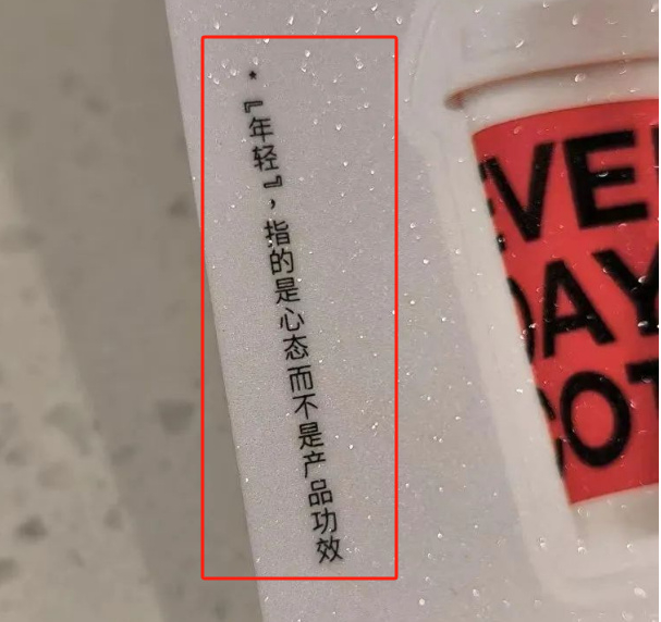 当然库迪估计也是花了不少心思琢磨这句话。既凸显王一博“酷盖”人设,还点到库迪slogan“喝库迪,更年轻”,堪称是一语双关。更有意思的是,库迪在包装袋上写了一行免责说明,求生欲可以说很强了。年轻,指的是心态而不是产品功效。