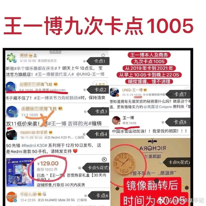 接下来更魔幻的一幕出现了。肖战粉丝和王一博粉丝在互相盘点对方的代言微博,发现出现了多次卡点的现象。