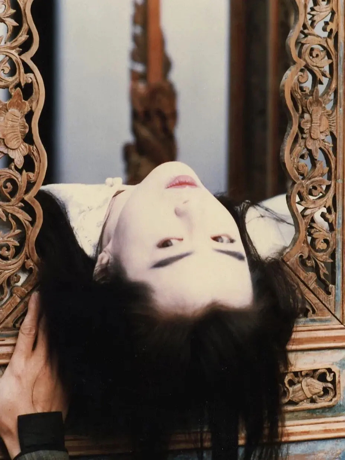 王祖贤涂着厚厚的粉底,嘴唇血红,目光呆滞苍白,没有任何的生命力,有种溢出屏幕的窒息感。