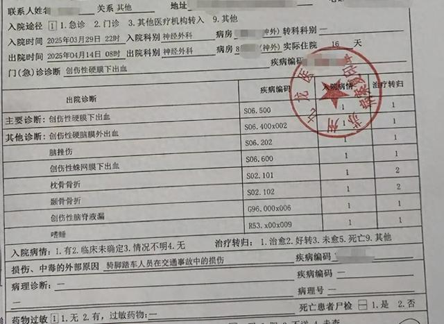 我们先从事件的源头说起。2025年3月29日晚,小张(化名)下班途中遭遇交通事故。对方转弯未让直行,被判定负全部责任。经医院诊断,小张枕骨骨折、蛛网膜下腔出血,病情危急,一度需要考虑开颅手术。