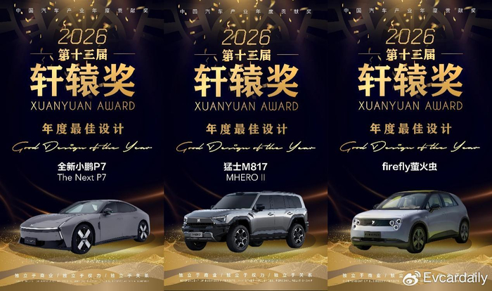 “中国年度最佳设计”则花落猛士M817、全新小鹏P7、firefly萤火虫,三款车型在造型语言、空间布局等方面的创新设计,成为行业创新的典范。