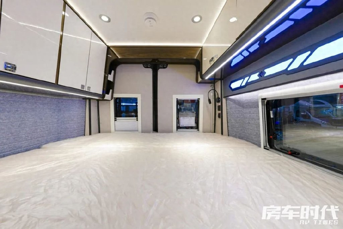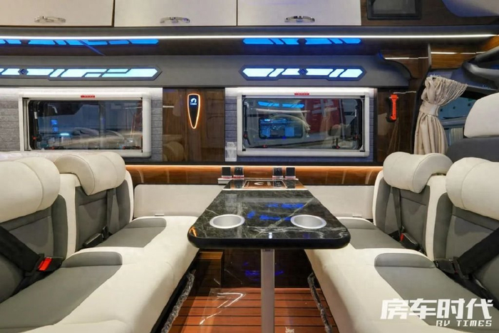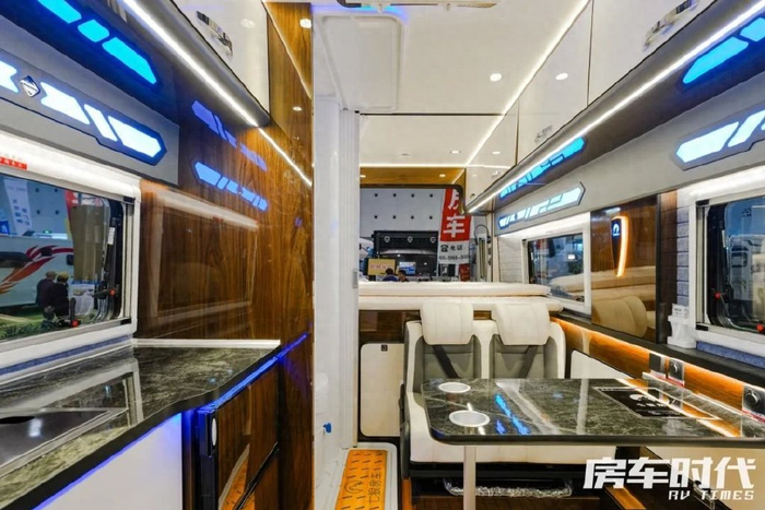 全车采用轻量化环保板材,既能减轻整车重量,又能提供高质量的旅居生活空间。内饰布局清晰,前方为驾驶室,中部为会客区、厨房区,尾部为休息区、卫生间。