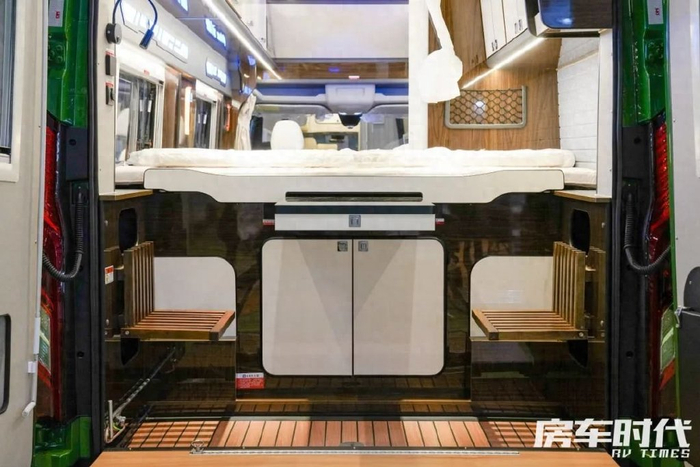 床下方配备抽拉式小桌板,方便乘客在需要的时候使用。这个小桌板可以用作用餐桌面、工作台或其他功能的支撑面。床两侧自带折叠小板凳,为乘客提供额外的座位,这些小板凳在不需要使用时可以折叠起来,节省车内空间。