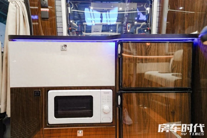 会客区对面为厨房,料理台面配备隐藏式可出冷热水的洗菜池、电磁炉,为乘客提供方便的烹饪设施。料理台下方配备有微波炉和102L弗罗斯特冰箱,方便冷藏和加热食物。