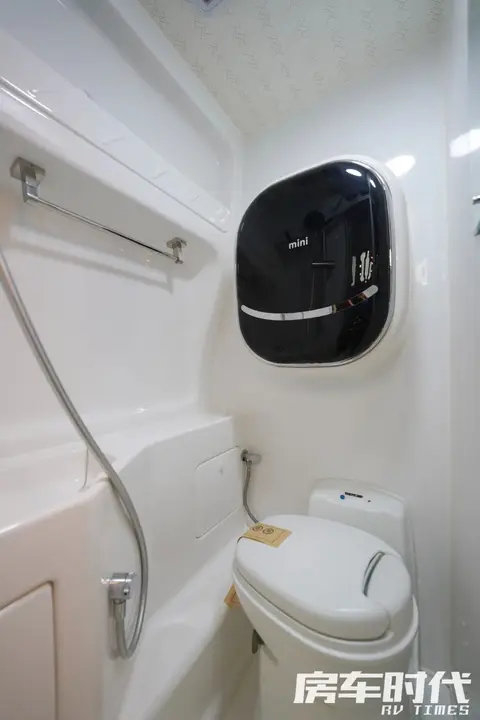 卫浴间为干湿一体式设计,空间虽小,但配置了独立花洒 、洗手池、梳妆镜、吊柜、防水插座、赛特福德C200可旋转坐便器,卫浴设施较为齐全,此外内部还配置了一台2.5kg进口大宇洗衣机,便于用户清洁衣物。