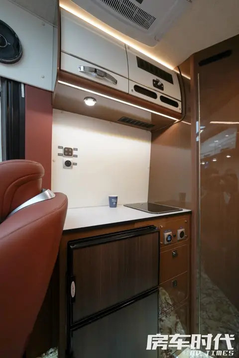 中门航空座椅后方为厨房区,配备了翻盖式水池,台面空间便于用户切配制餐,台面下方内嵌了一台102L弗罗斯特房车冰箱,可在路途中存放食物使用。