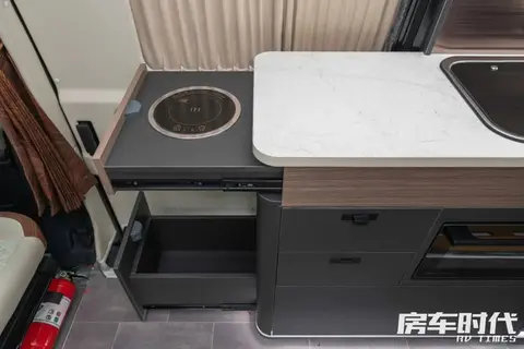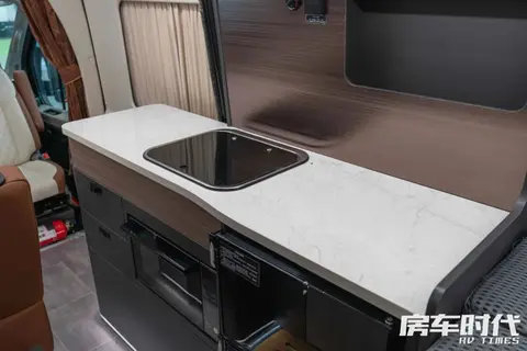厨房区设置在车厢一侧,一体式橱柜从床侧一直延伸到中门,操作空间非常可观,区域内为用户配置了抽拉式电磁炉、储物柜、带盖板洗菜池、微波炉和102L双开门冰箱,满足了用户旅居食物储藏和烹饪的需求。