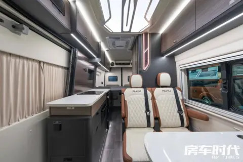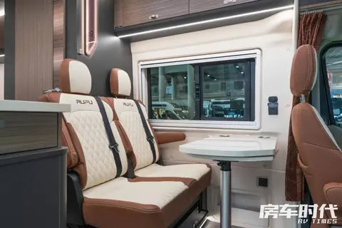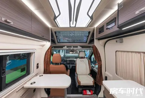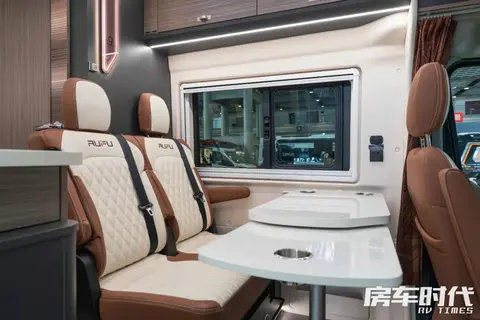 会客区为单排双座布局,乘用车级双人折叠座椅可侧拉调整,前侧还配置了可收纳手动升降餐桌,桌面可侧拉拓展,满足了用户丰富的使用需求;侧窗为大尺寸横移窗,可在行车过程中开启。