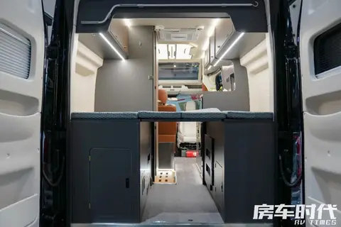 车尾为固定横床设计,两侧拓展盲窗进一步增加了床铺空间,尺寸可达2050×1300mm;区域内配置电源接口等便利性设施,上方为储物吊柜设计,便于用户拿取生活物品。