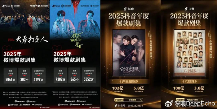 不只是站内,腾讯视频在社交内容平台也获得“爆款认证”。今年微博认证爆款剧集有5部,其中腾讯视频有《大奉打更人》和《猎罪图鉴 II》;抖音认证爆款剧7部,腾讯视频也以《许我耀眼》和《六姊妹》占据两席。这也证明剧集在不同传播语境下实现有效外溢,从圈层热度跃升为公共话题,成为全网性“爆款”。
