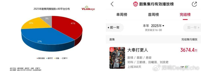 Vlinkage数据显示,在年度网播指数80+的剧集中,腾讯视频以41%的占比覆盖最广;在网播指数TOP20年榜中共有9部作品上榜,占比高达45%。云合数据显示,在集均V30超过3000万的12部剧集中,腾讯视频占4席,与爱奇艺并列第一;其中《许我耀眼》更是2025年全网唯一一部集均V30突破6000万大关的剧集。此外猫眼数据还显示《大奉打更人》登顶全网剧集集均有效播放完结榜榜首。