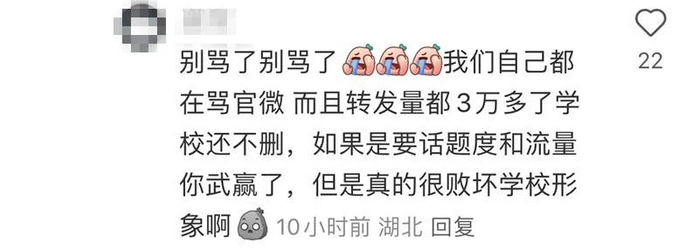 “没觉得两校的宣传有什么不妥,正好是两对情侣中双方的定位,主人公享受其中,旁人有人什么好酸葡萄的呢。”