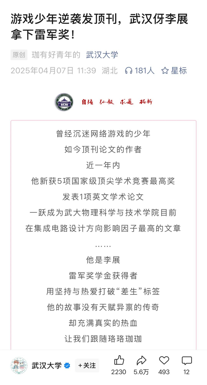 先说武汉大学的事儿哈,武大官微4月7号发了一篇文章《游戏少年逆袭发顶刊,武汉伢李展拿下雷军奖》。