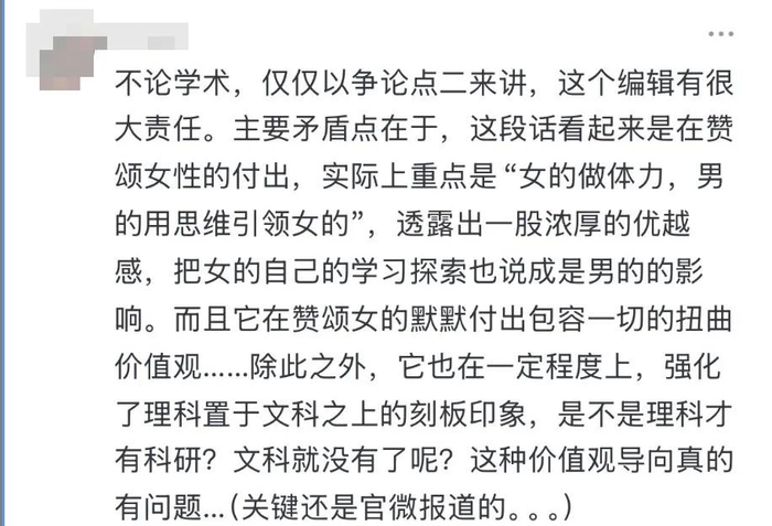 武大官微和清华官微的问题都在于,它只呈现了“传统分工和谐版”,却对“女生主导科研+男生支持后勤”的组合绝口不提。