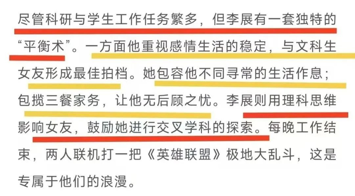 “尽管科研与学生工作任务繁多,但李展有一套独特的“平衡术”。一方面他重视感情生活的稳定,与文科生女友形成最佳拍档。她包容他不同寻常的生活作息;包揽三餐家务,让他无后顾之忧。李展则用理科思维影响女友,鼓励她进行交叉学科的探索。每晚工作结束,两人联机打一把《英雄联盟》极地大乱斗,这是专属于他们的浪漫。”