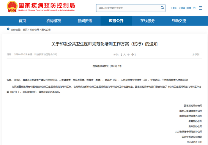 1月28日,国家疾控局等7部门联合发布《公共卫生医师规范化培训工作方案(试行)》(以下简称《方案》),探索创新医防管交叉复合型人才培养模式。