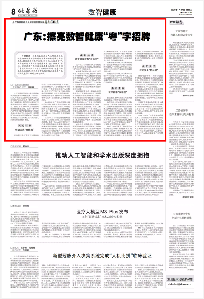 为展现各地推动人工智能在卫生健康领域深度融合与创新发展的积极进展与典型成果,促进地区间互学互鉴,《健康报》推出“人工智能赋能卫生健康高质量发展·委主任视点”专栏,首期邀请广东省卫生健康委党组书记、主任刘利群,介绍广东省近年来在人工智能辅助临床诊断、智慧公共卫生系统构建、科研教学智能化升级以及健康产业创新发展等方面的实践与成效。