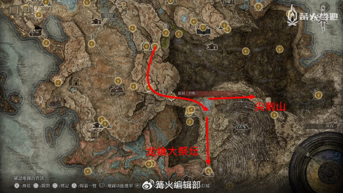 从「通柱坡中段」出发,沿路往南,顺着各种断头龙雕像走,来到下图的「龙洞」,一路打败深处 Boss「古龙人」,会进入新区域「尖刺山」。