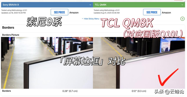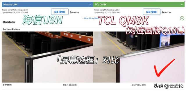 不仅画质领先,TCL的外观颜值同样出众,从Rtings具体测量的数据来看,索尼9系的边框厚度为0.7cm,海信U9N则是来到了1.3cm,而TCL QM8K的边框厚度仅有0.3cm,能更好地减少视觉干扰、增强沉浸感,还能提升空间适配性与设计美感。并且,在TCL极景·无黑边技术的作用下,这款QM8K还把传统电视的黑边压缩至极致,实现接近100%的可视面积,直接做到“屏幕即画面”。